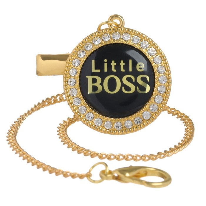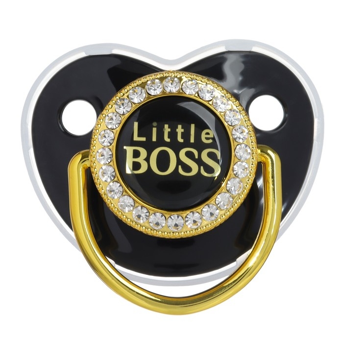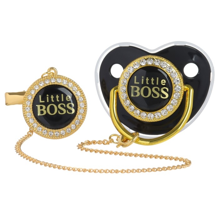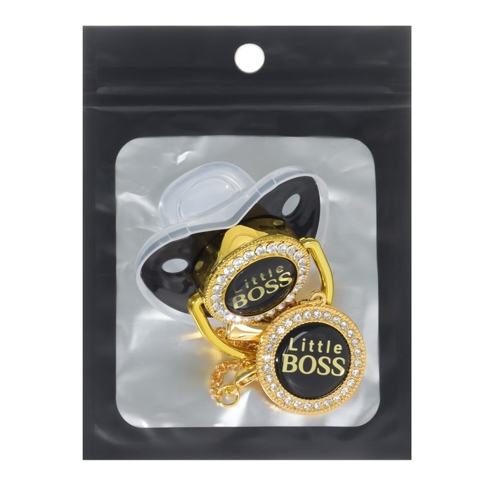 Соска - пустышка силиконовая ортодонтическая «Маленький БОСС», от 6 мес., с колпачком + держатель - цепочка, цвет черный/золото, стразы
