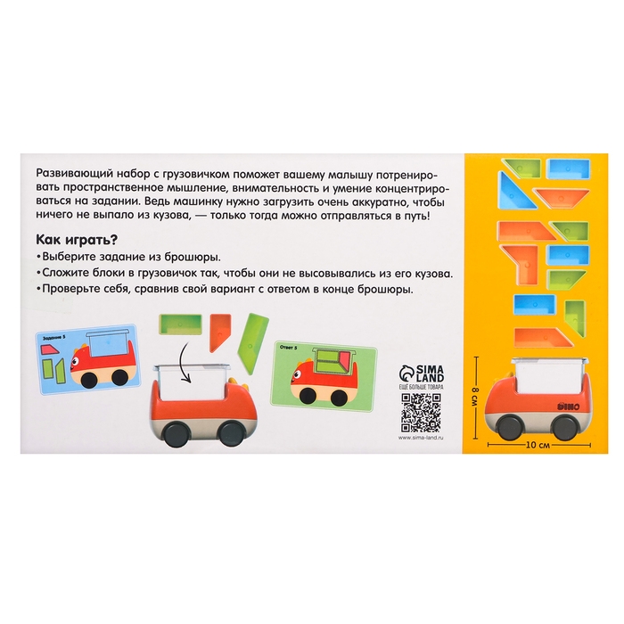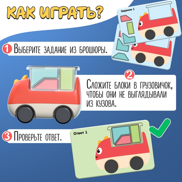 Развивающий набор «Загрузи машинку» поможет малышам от 3 лет потренировать пространственное мышление, внимательность, моторику, и умение концентрироваться на задании. Ведь машинку нужно загрузить очень аккуратно, чтобы ничего не выпало из кузова.