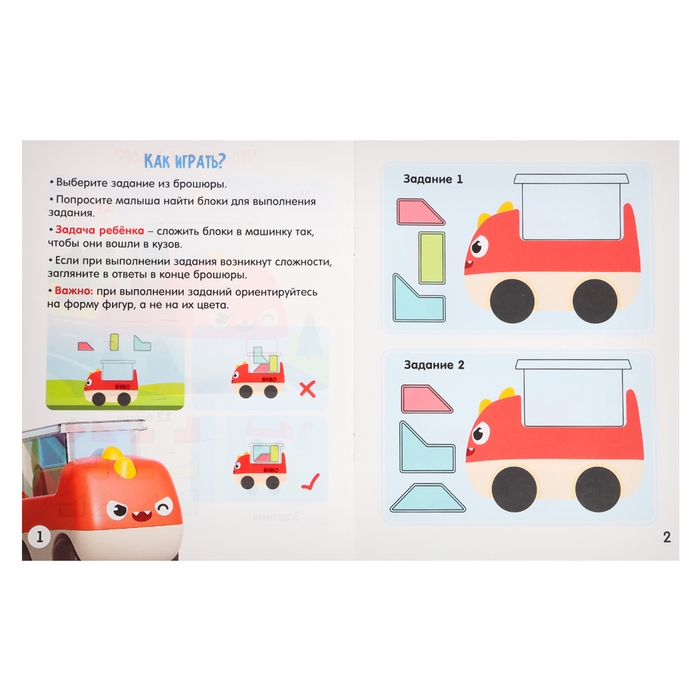 Внутри вы найдёте яркую машинку, 12 разноцветных блоков и брошюру с заданиями.