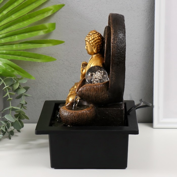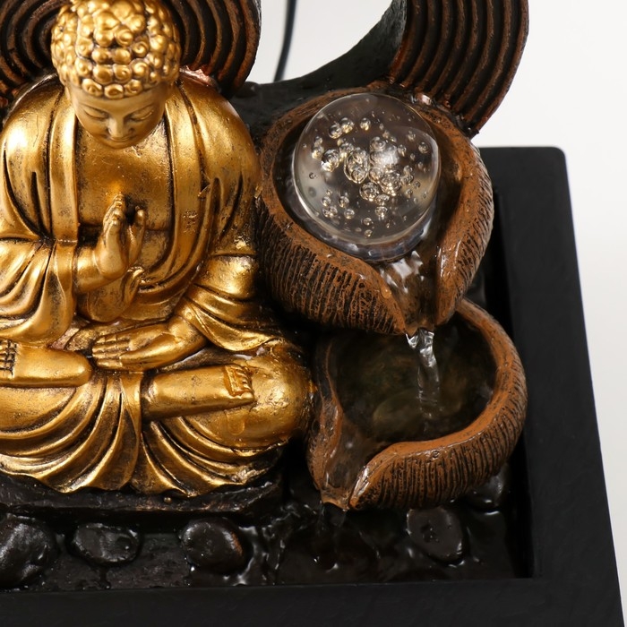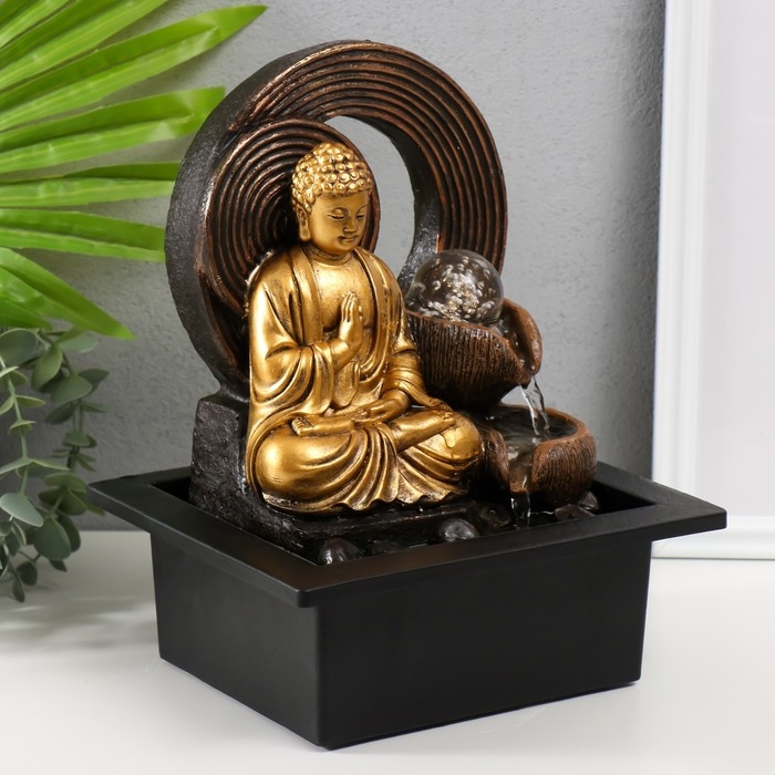 Фонтан настольный от сети, подсветка "Золотой Будда у фонтана с кольцами" 21х17,5х26 см