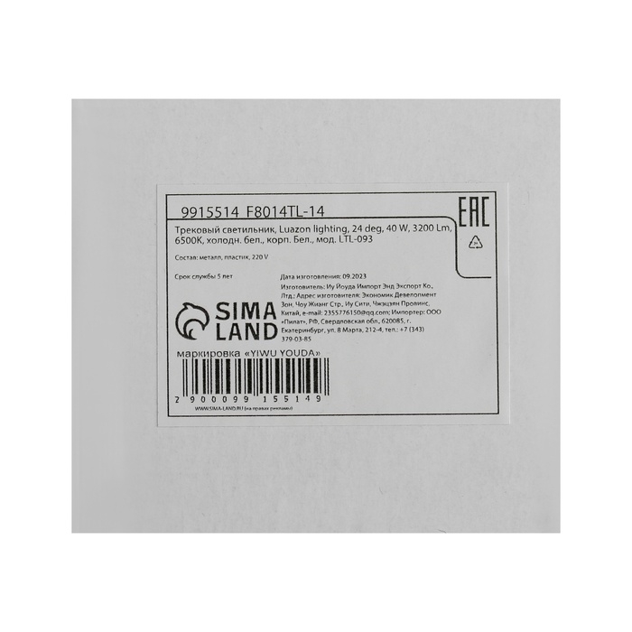 Трековый светильник, Luazon Lighting, LTL-093 40 W, 3200 Lm, 6500K, белый