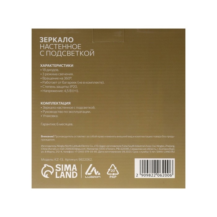 Зеркало Luazon KZ- 13, подсветка, настенное, 18 диодов, 3 режима свечения, от батареек 3*ААА