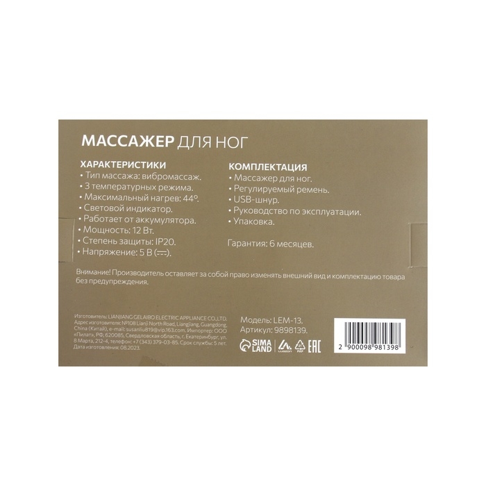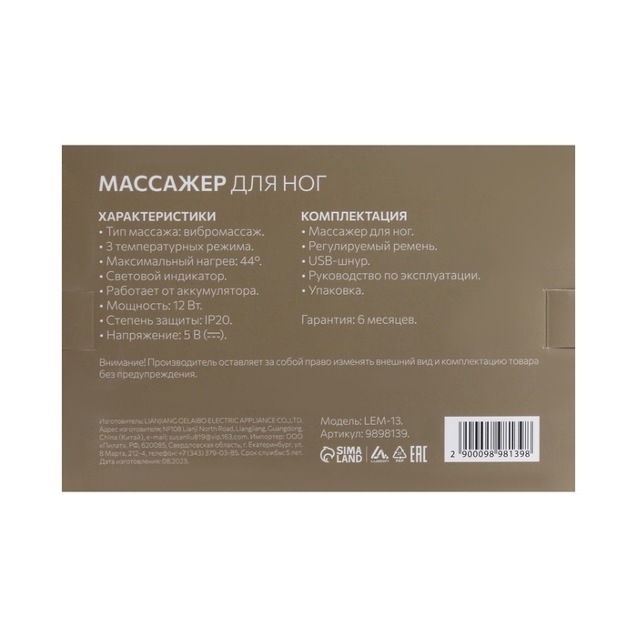 Массажёр для ног LuazON LEM-13, бандаж на колено, 3 температурных режима, АКБ, черный