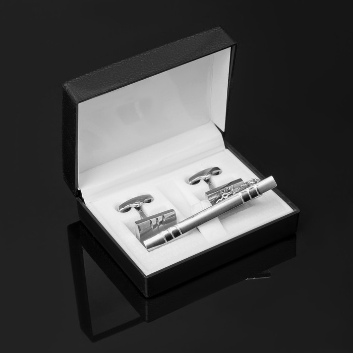 Набор мужской стальной «Запонки + Зажим для галстука» прямоугольник, цвет чёрно-белый в серебре