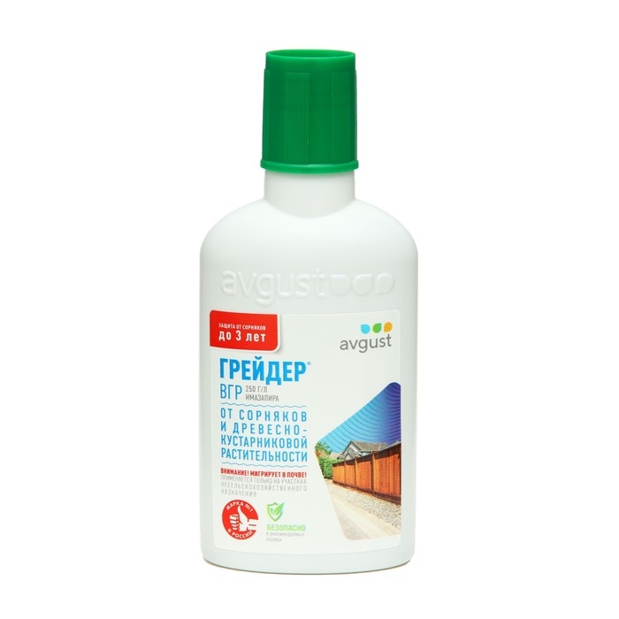 Грейдер - системный гербицид сплошного действия для уничтожения всех видов нежелательной травянистой и древесной растительности. Применяется на землях несельскохозяйственного назначения.Препараты от сорной растительности обладают ограниченным сроком действия. Такие свойства вполне оправданы и необходимы для того, чтобы после очистки территорий была возможность что-то на них посадить. Но бывают ситуации, когда нужно освободить участок под постройку дома или, например, избавиться от сорняков на погосте на длительное время. Здесь на помощь и приходит Грейдер. Он уничтожает все виды нежелательной травянистой и древесно-кустарниковой растительности, ему подвластны даже злостные и карантинные сорняки, в том числе амброзия полыннолистная. Также Грейдер легко справляется с лиственной и хвойной порослью, например, осиной, березой, ольхой, ивой, сосной, елью и др. Препарат обладает высокой почвенной активностью и уничтожает не только существующие сорняки, но и новые всходы на срок до 3-х лет (в зависимости от нормы расхода, количества сорняков, типа почвы и др.). Уже через час после обработки гербицид не смывается дождем, результативен при широком диапазоне температур. Несмотря на то, что Грейдер малотоксичен для млекопитающих, птиц и пчел, подходить к его применению нужно со всей ответственностью, дабы не уничтожить полезные культуры. Не проводите обработку ближе нескольких метров к таким растениям, препарат имеет умеренную миграцию в почве, поэтому способен негативно повлиять на их развитие. При использовании препарата важно четко следовать инструкции и не превышать допустимых норм. Тогда Грейдер станет незаменимым помощником для борьбы с сорняками на непосевных территориях.В течение первых суток после обработки прекращается рост и развитие растений. Видимые признаки повреждений проявляются через 7-14 дней в виде обесцвечивания и побурения точек роста. Полная гибель травянистой растительности наступает через 1-2 месяца, древесно-кустарниковой – через 2-3 месяца. Мощное средство длительного действия против любой растительности.Полное уничтожение всех видов сорняков даже самых злостных и нежелательной древесно-кустарниковой растительности.Защищает на срок до 3 лет.Действует на надземную часть сорняков и их корневую систему.Устойчив к смыванию дождём уже через час после обработки. Действующее вещество: 250 г/л имазапира.Препаративная форма: ВГР - водно-гликолевый раствор.Производитель: АО Фирма «Август», Россия.Фасовка: 10 мл, 50 мл, 100 мл, 500 мл (флакон).Срок годности: 4 года.