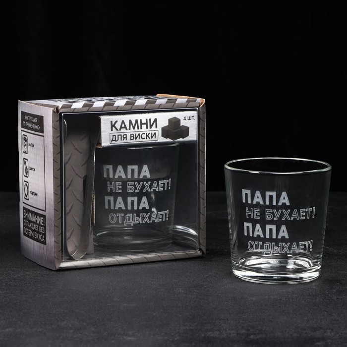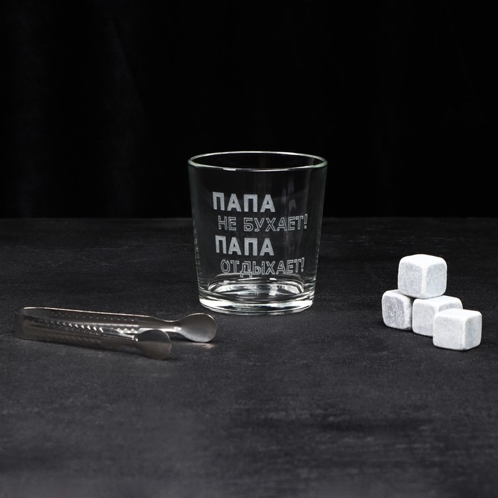 Набор «Папа не бухает!», стакан стеклянный 250 мл, камни для виски, щипцы