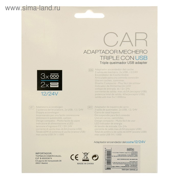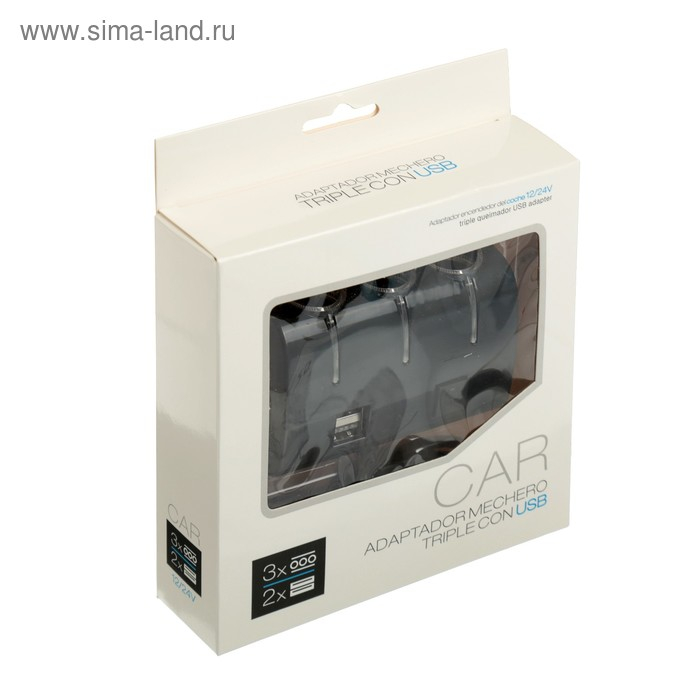 Разветвитель прикуривателя, 3 гнезда, 2 USB 1 А, 60 Вт, 12/24 В, подсветка, провод 70 см