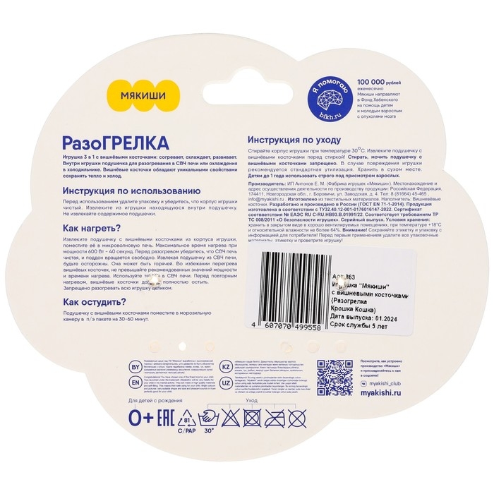 Подходит для мальчиков и для девочек.Плюшевая игрушка выполнена из качественного гипоаллергенного материала. Внутри игрушки подушечка с вишнёвой косточкой для разогревания в микроволновке или охлаждения в холодильнике. Вишнёвые косточки обладают уникальными свойствами сохранять тепло и холод. Игрушка успокоит животик малыша при коликах и охладит при ушибах, а также будет способствовать развитию мелкой моторики