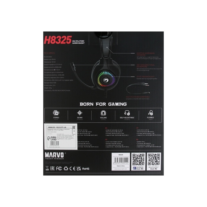 Наушники Marvo H8325, игровые, полноразмерные, микрофон, USB + 3,5 мм, 2 м, RGB, чёрные