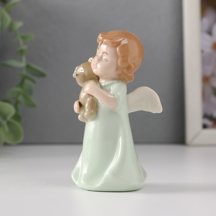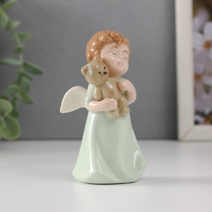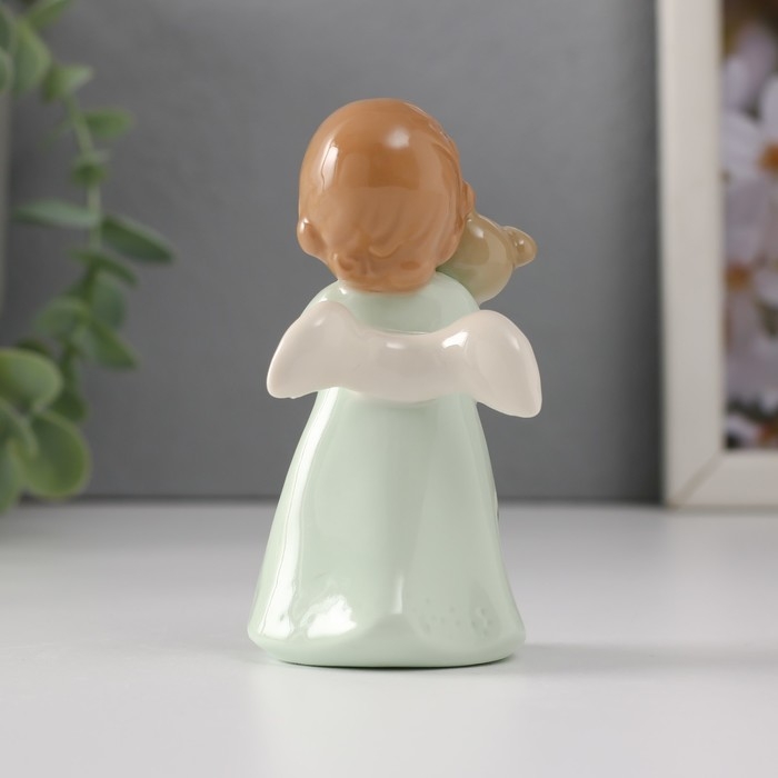 Сувенир керамика "Малышка-ангел в зелёном платье с медвежонком" 5х4х9 см
