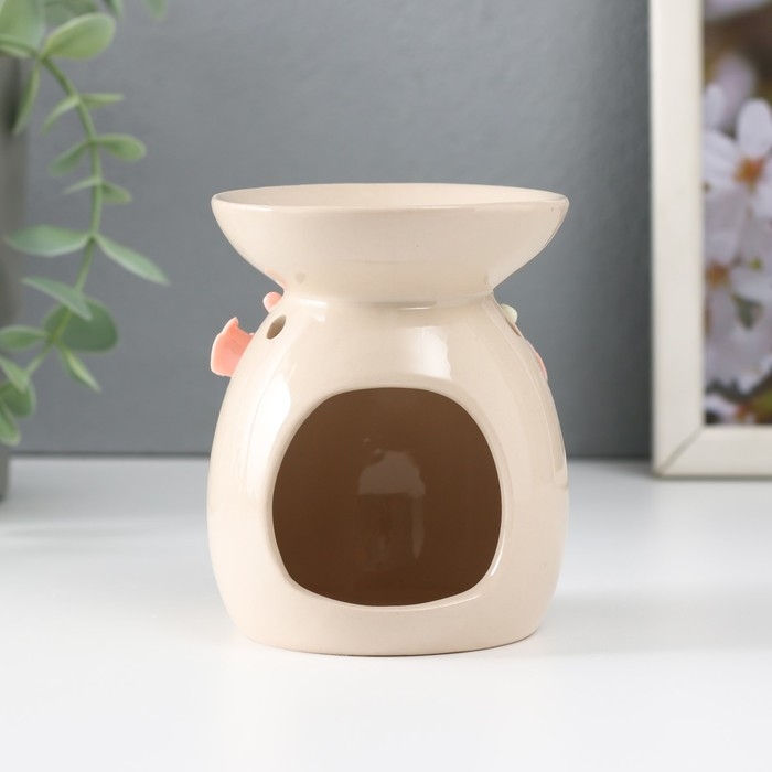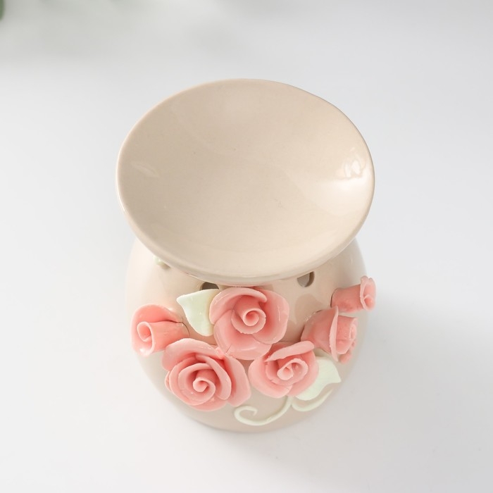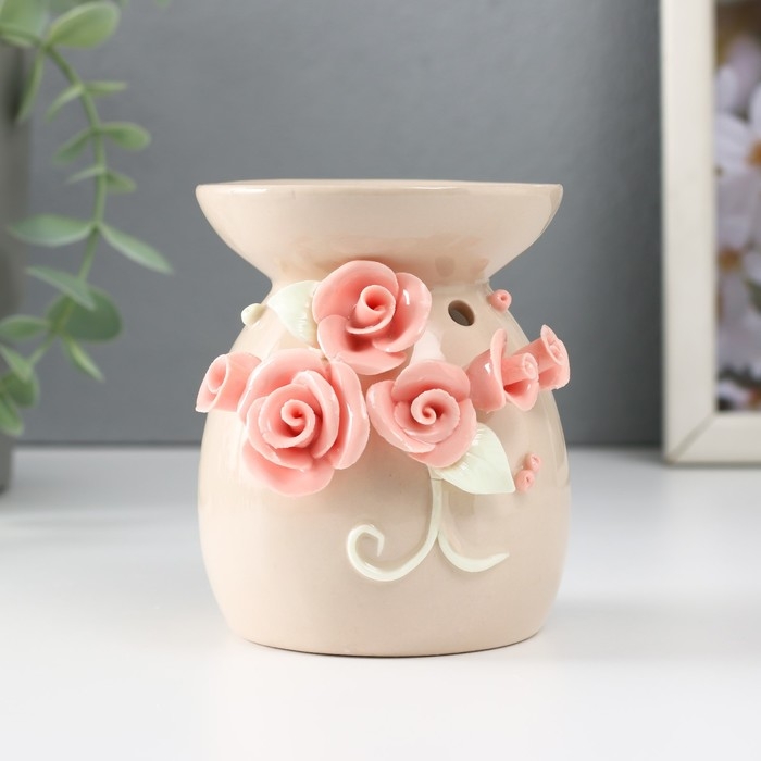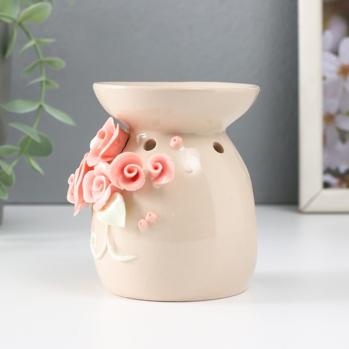 Аромалампа керамика "Розовые розы с листиками" бежевая 7,5х7,5х9 см
