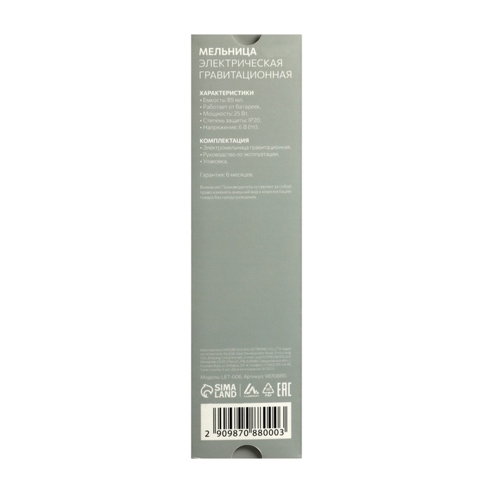 Мельница электрическая Luazon LET-003, гравитационная, пластик, от батареек, черная