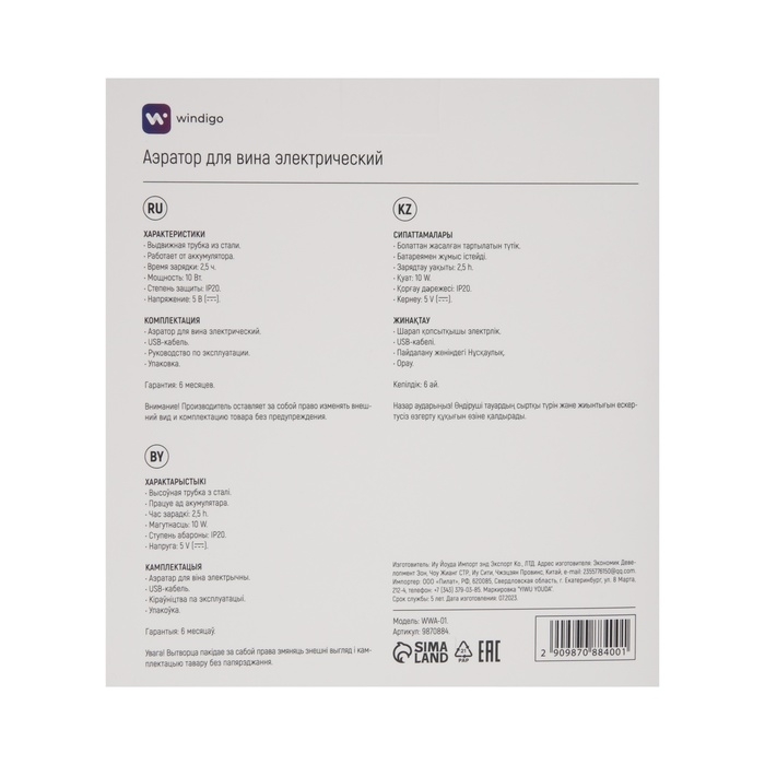 Аэратор для вина Windigo WWA-01, 10 Вт, электрический, АКБ, черный