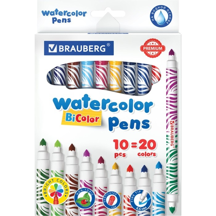 Набор двусторонних фломастеров BRAUBERG PREMIUM "BI-COLOR" высокого качества в количестве 10 штук, 20 цветов. Насыщенные цвета оставляют яркий след на бумаге. Легко смываются водой с рук и одежды.