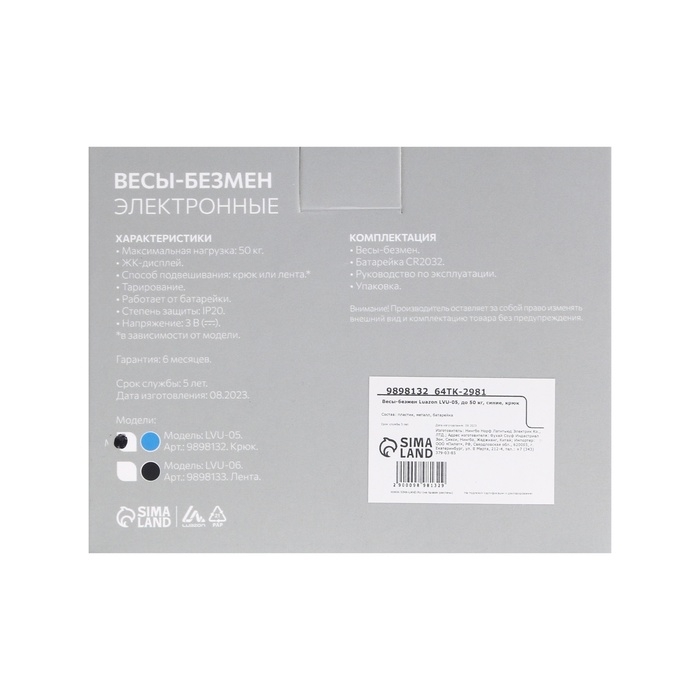 Безмен Luazon LVU-05 помогут быстро и точно взвесить ваши вещи. Благодаря крепкому сцеплению из металла взвешивать даже самые тяжелые сумки стало гораздо удобней и безопасней. Надежная конструкция не позволит тяжёлому грузу неожиданно упасть в момент взвешивания.