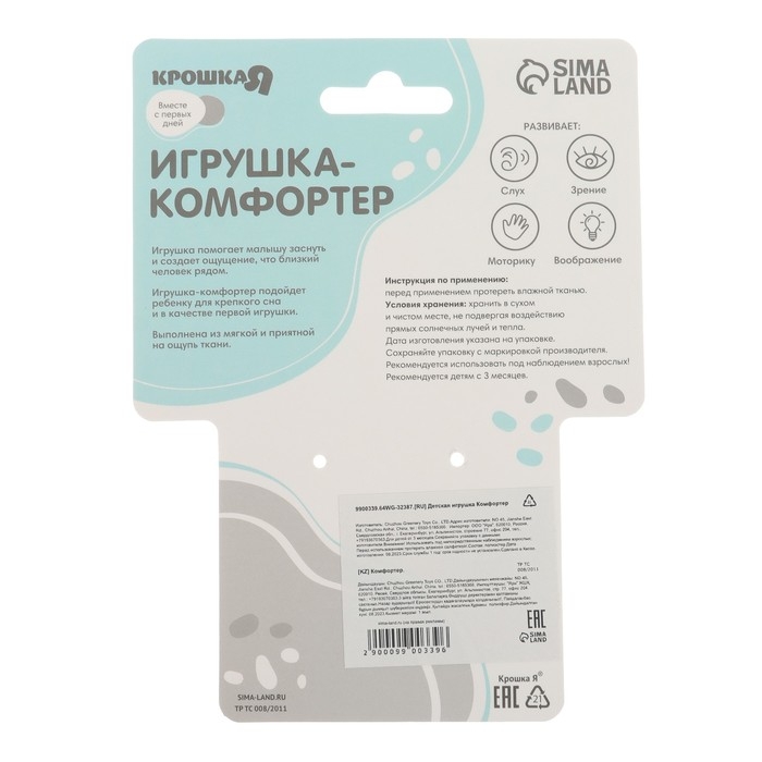 Такое изделие подойдёт ребёнку не только для крепкого сна, но и в качестве первой игрушки. Комфортер выполнен из плюшевой ткани, мягкой и приятной на ощупь.