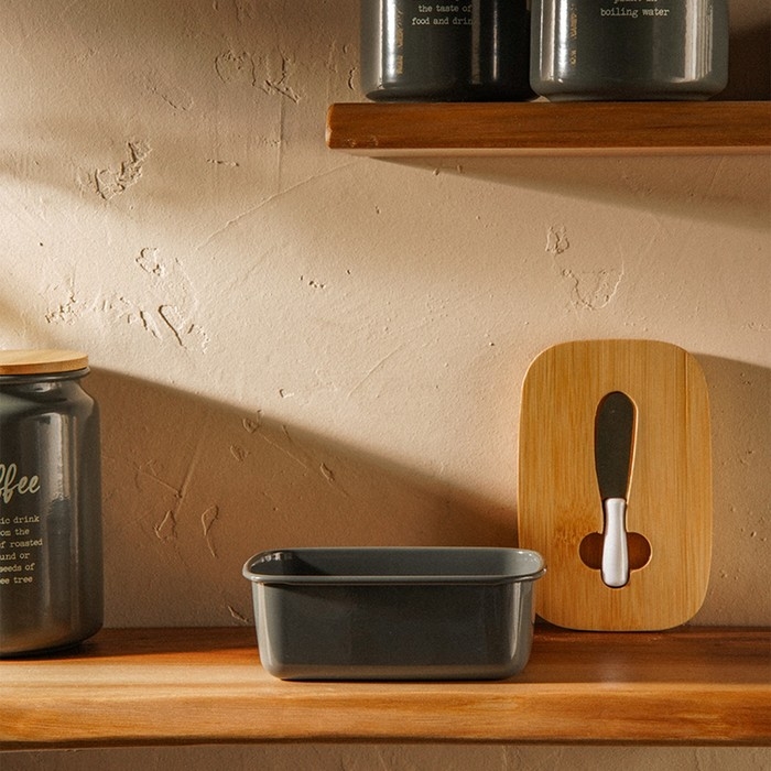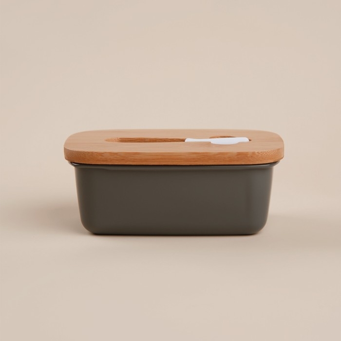 Маслёнка выполнена из прочной оцинкованной стали, что гарантирует её долговечность и стойкость к повреждениям. Крышка из натурального бамбука добавляет природного тепла и гармонии, а также надежно защищает масло от посторонних запахов и пыли. Прямоугольная форма изделия идеально подходит для хранения стандартных пачек масла, обеспечивая легкий доступ и экономию места в холодильнике.