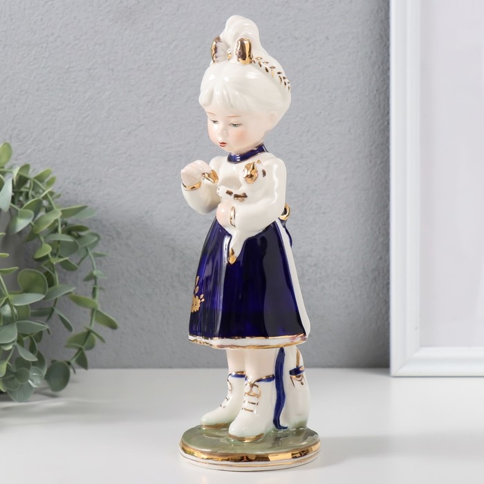 Сувенир керамика "Девочка играет котёнком" кобальт 7,3х7,3х22,5 см