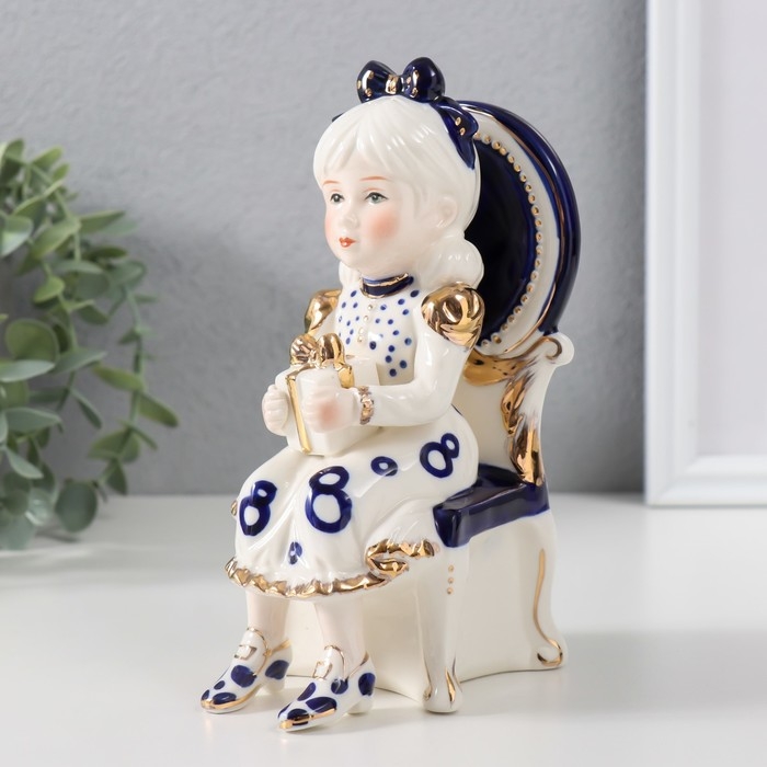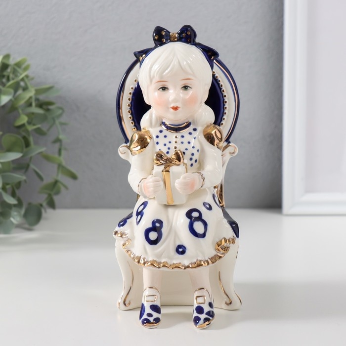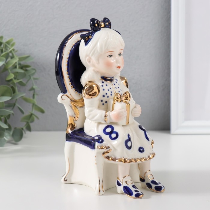 Сувенир керамика "Девочка сидит в кресле с подарком в руках" кобальт 7,5х10х17 см
