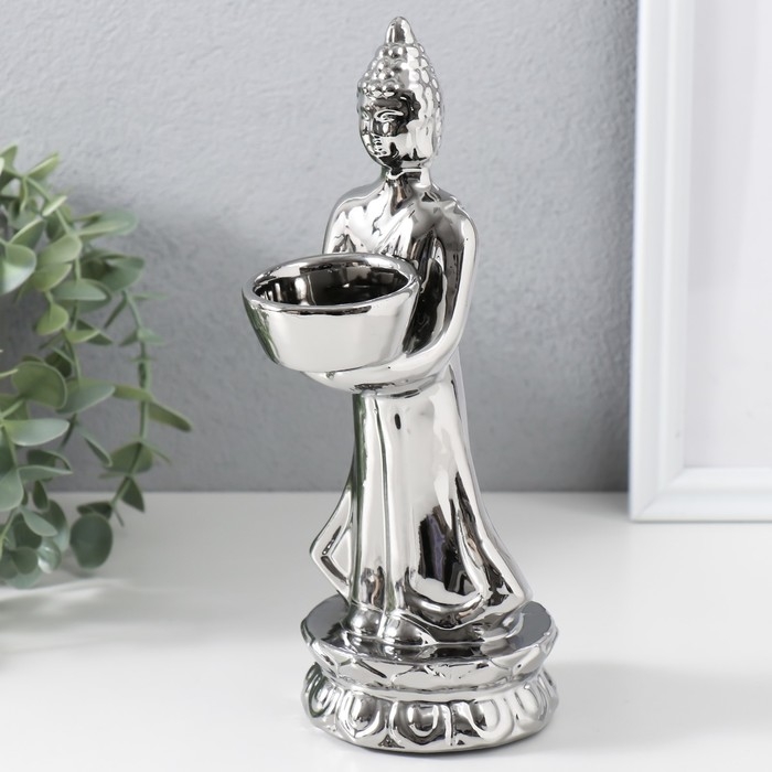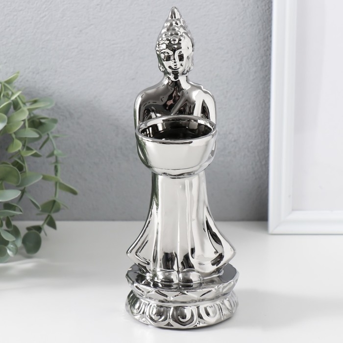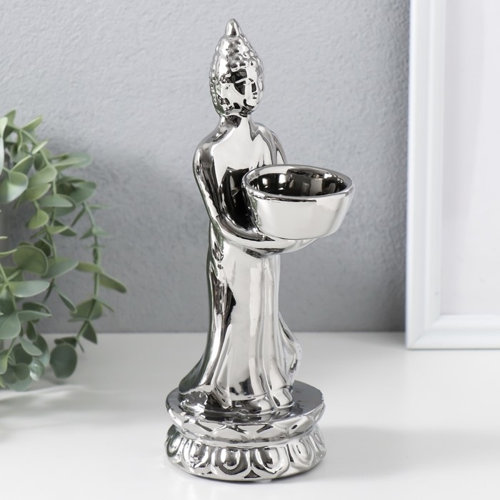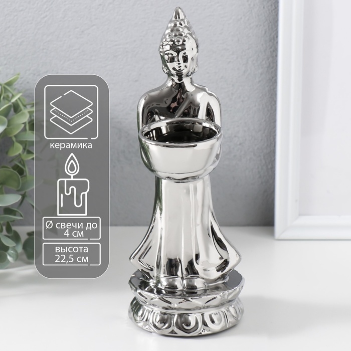 Подсвечник керамика на 1 свечу "Будда" d=4 см серебро 8х11х22,5 см