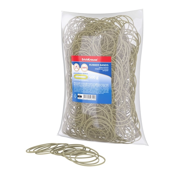 Банковская резинка, 500 г, ErichKrause, диаметр 40/60 мм, длина 60/100 мм, 100% каучук, в пакете, натуральный цвет