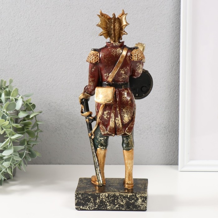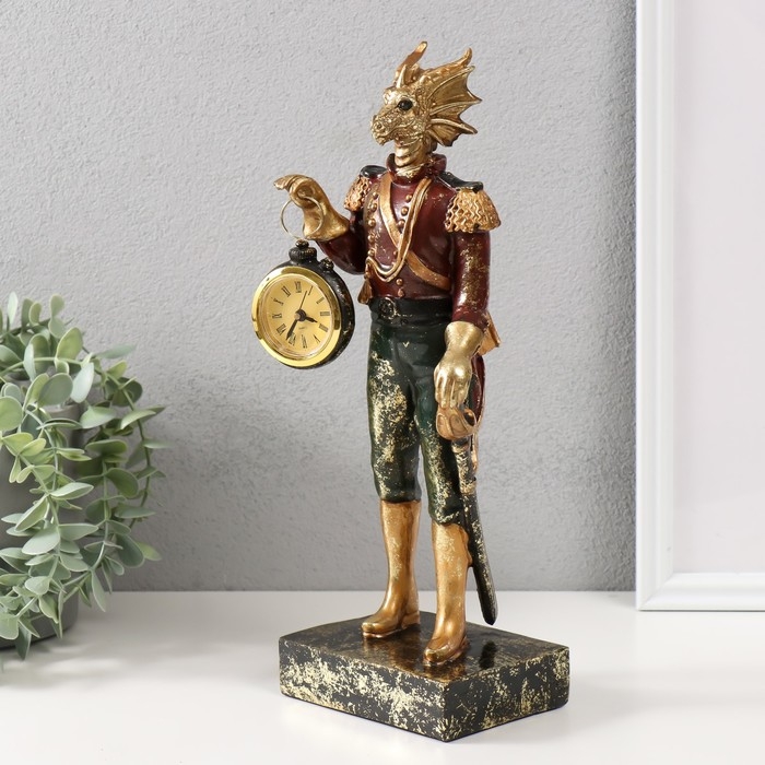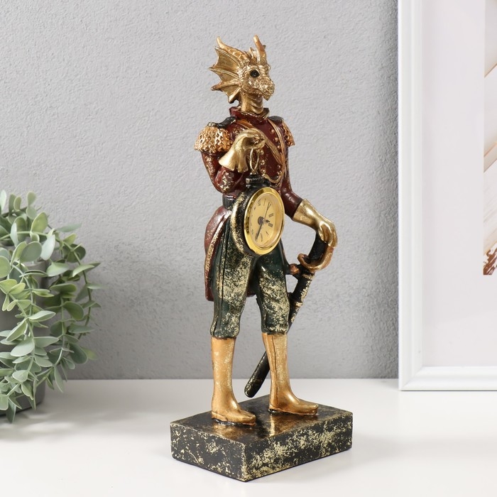 Сувенир полистоун с часами "Золотистый дракон в камзоле, со шпагой" 12х9х32 см