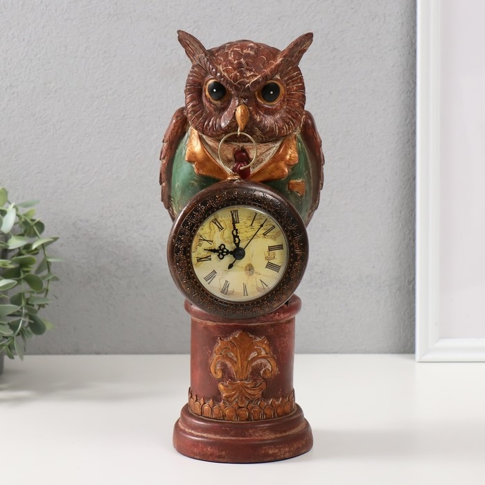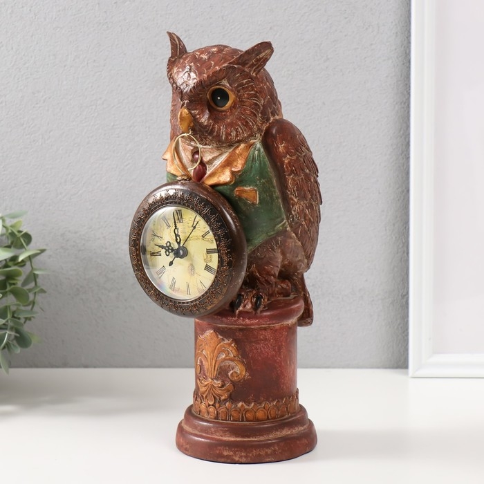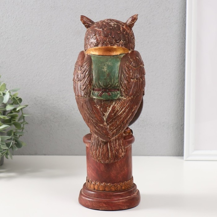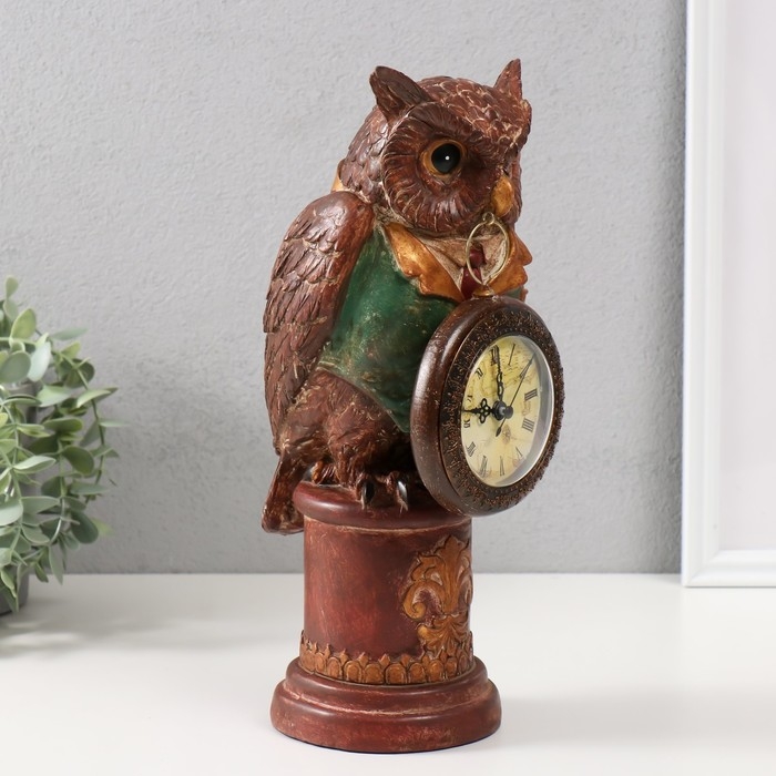 Сувенир полистоун с часами "Филин в зелёном пиджаке на колонне" 15х12,5х32 см