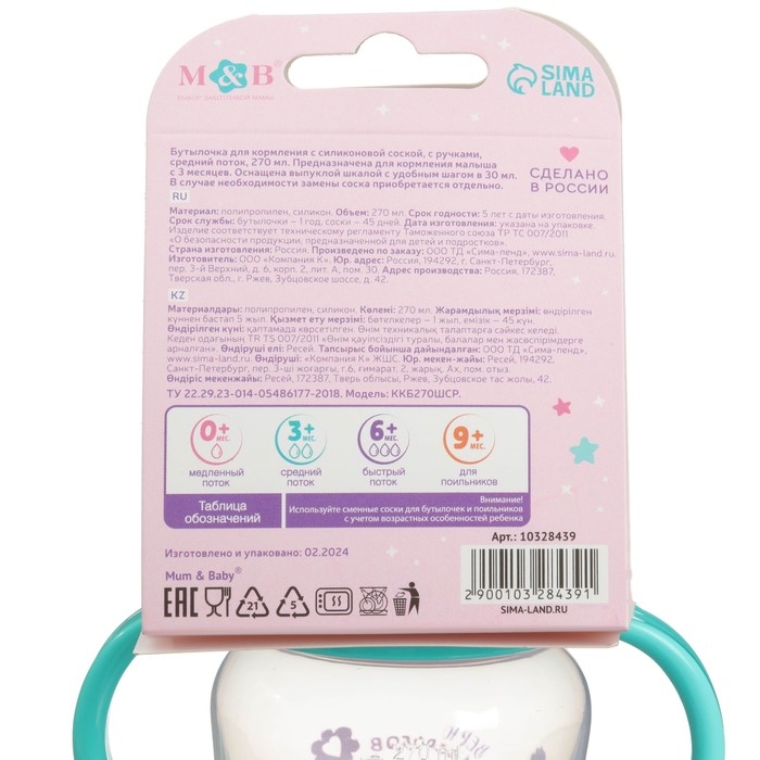 Бутылочка для кормления, широкое горло, средний поток от 3 мес., 270 мл., «Единорог», M&B