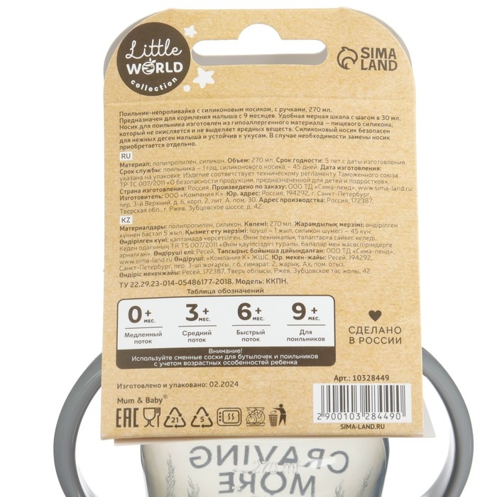 Поильник-непроливайка, мягкий носик, от 9 мес., 270 мл., Little world collection, M&B