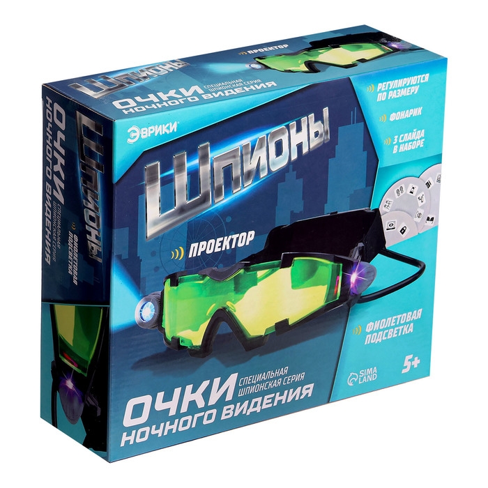 Очки ночного видения — необходимый атрибут для любого шпиона! Эта игрушка способна надолго увлечь ребёнка. У очков есть складное увеличительное стекло с его помощью в темноте можно разглядывать маленькие предметы.