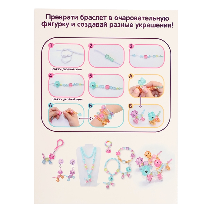 - В комплекте вы найдёте наглядную инструкцию, как создать украшения и забавных зверят.