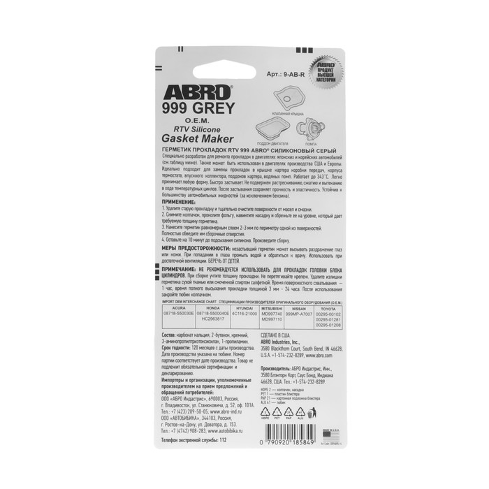 Герметик прокладок силиконовый ABRO OEM серый 999, 85 г 9-AB