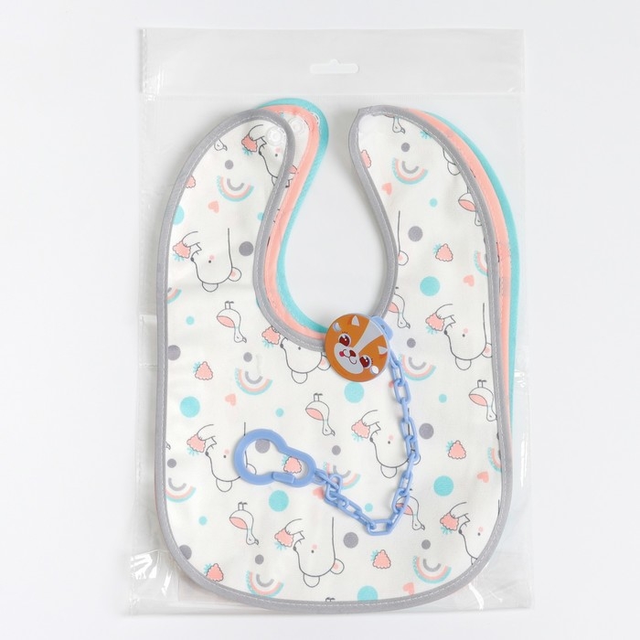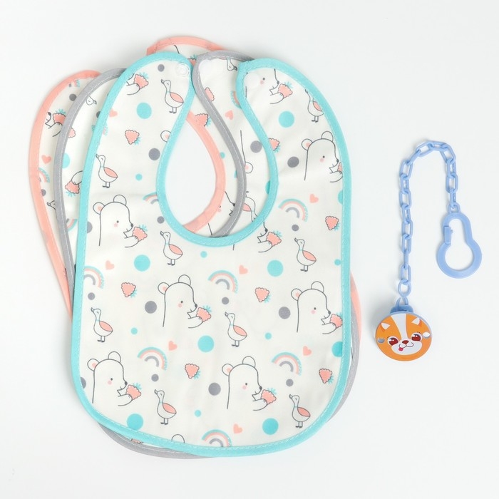 Набор детских слюнявчиков Крошка Я, 3 шт. + подарок, 29х20 см., цвет бирюзовый, розовый, серый