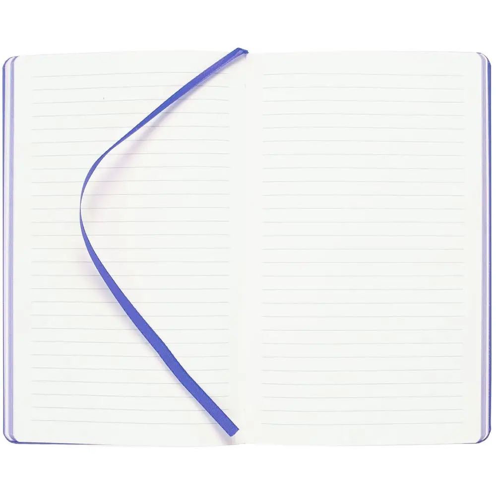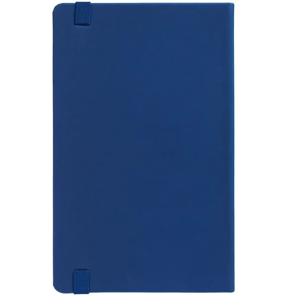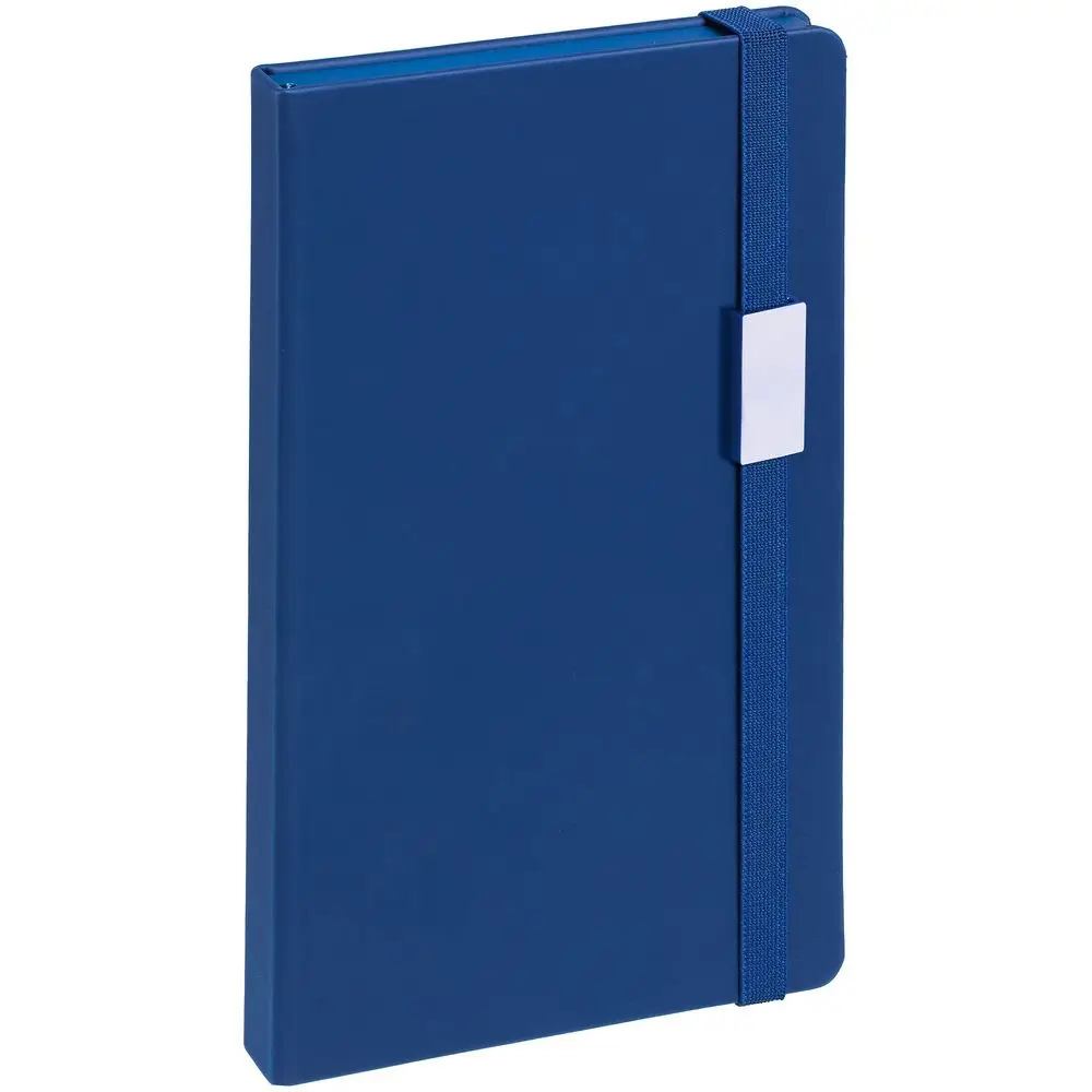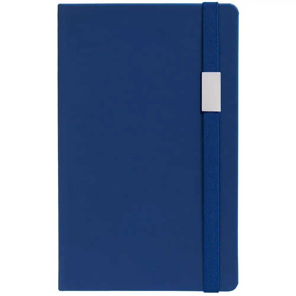 Блокнот в твердой обложке, выполнен из материала Soft Touch Pearl, синий НН, дополнен резинкой и ляссе в цвет обложки.
