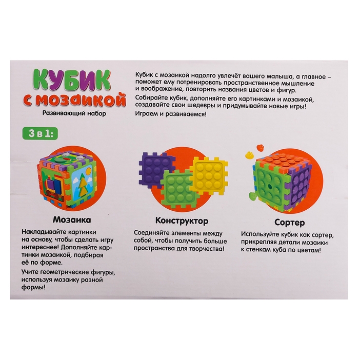 Развивающий набор «Кубик с мозаикой» привлечёт внимание трогательным дизайном и надолго займёт малыша благодаря множеству полезных функций. Игрушка не только развлечёт ребёнка — с ней можно осваивать новые навыки!