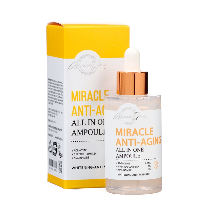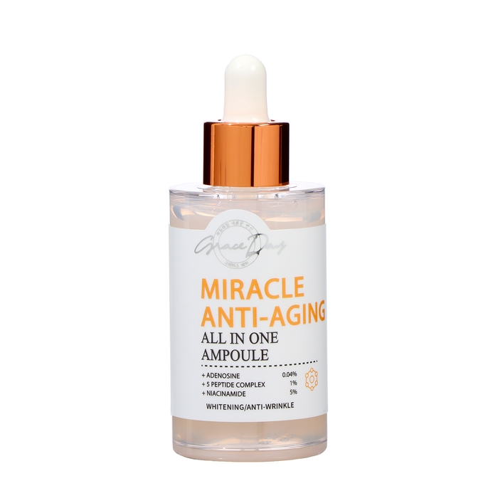 Для омолаживающего ухода за лицом специалисты Grace Day предлагают использовать сыворотку Miracle Anti Aging All In One Ampoule, которая обогащена пептидами и другими биоактивными веществами для интенсивного комплексного ухода за возрастными покровами. Проникая вместе с впитывающейся сыворотку в толщу эпидермиса, полезные вещества улучшают состояние кожи и снаружи, и изнутри. Пептиды активизируют выработку коллагена и эластина, улучшают обмен веществ, поддерживают процессы клеточного обновления и повышают защищенность тканей от негативного влияния внешней среды. Пептидный комплекс с 5 компонентами работает в сочетании с аденозином. Сыворотка разглаживает морщины, повышает упругость и эластичность эпидермиса.
