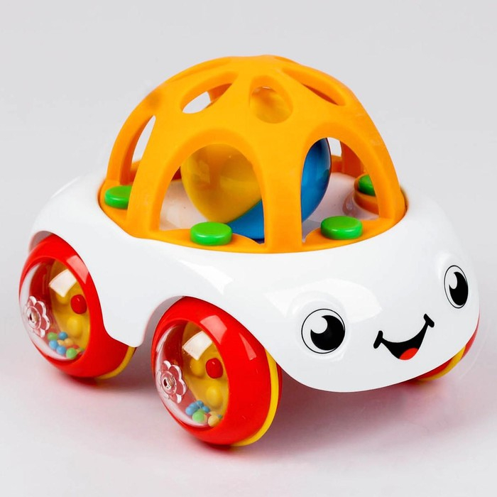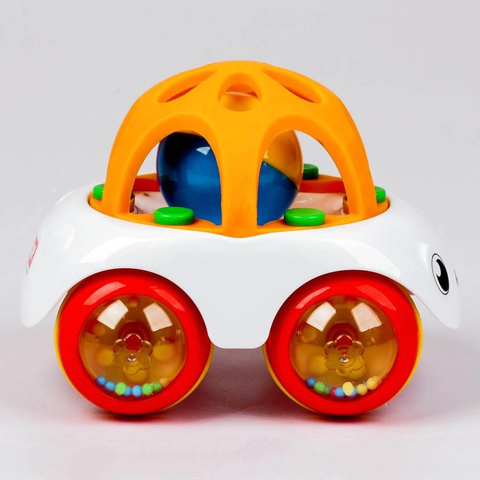 Колеса машинки наполнены маленькими разноцветными шариками, которые весело пересыпаются и издают привлекающий внимание малыша звук.