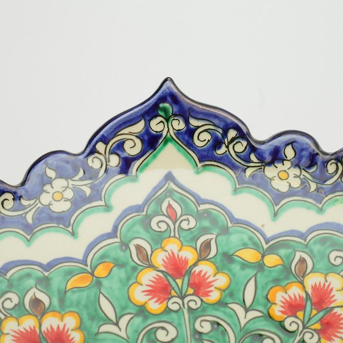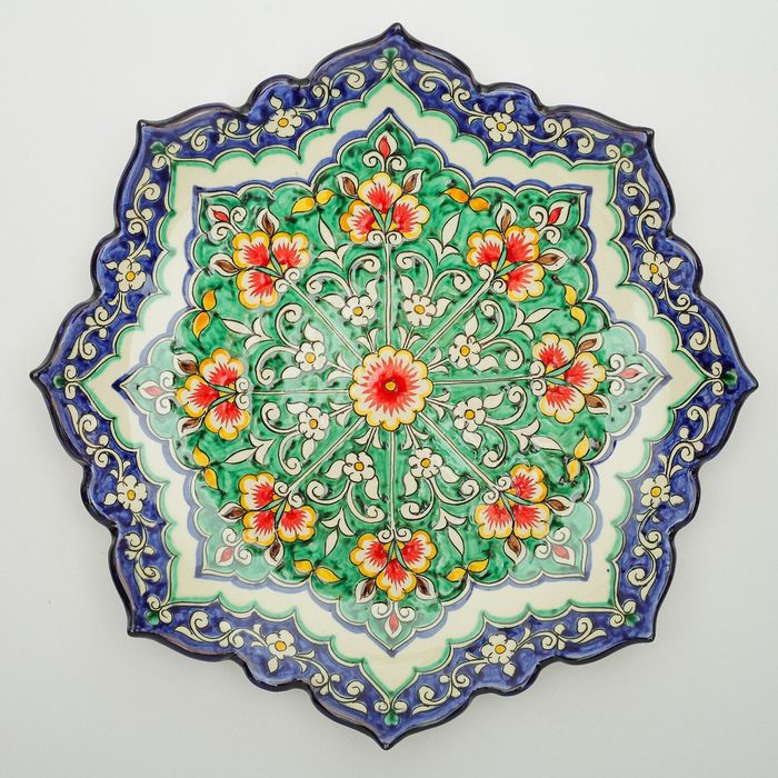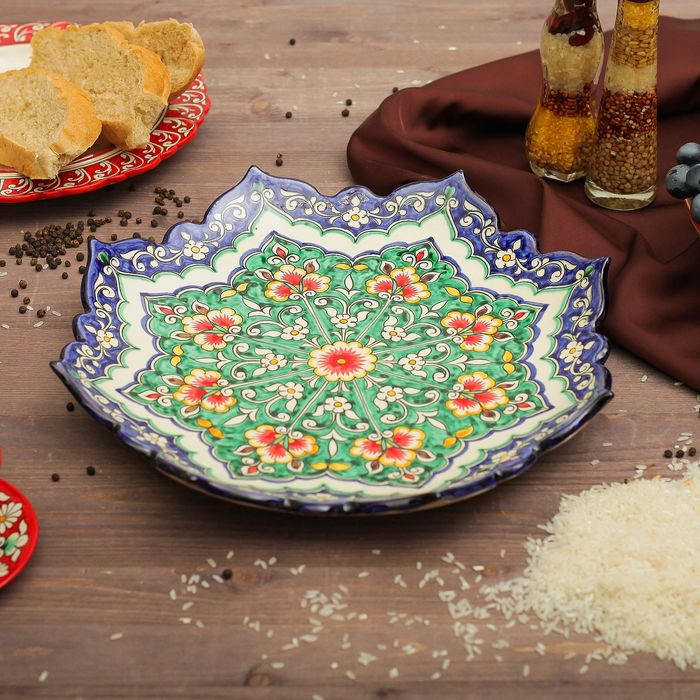 Ляган Риштанская Керамика "Цветы", 32 см, сине-зелёный, рифлённый
