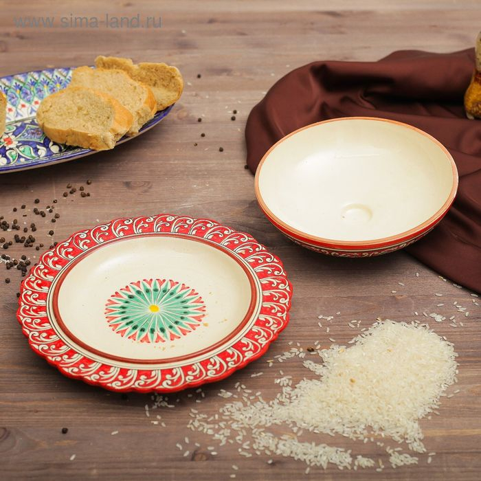 Блинница Риштанская Керамика "Цветы", 24 см, красный
