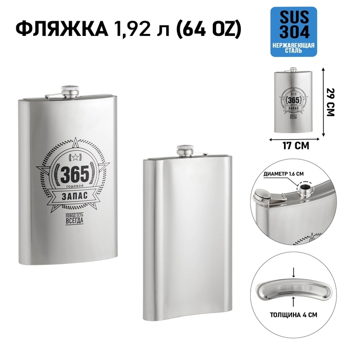 Фляжка для алкоголя и воды "Запас", нержавеющая сталь, подарочная, армейская, 1.92 л, 64 oz
