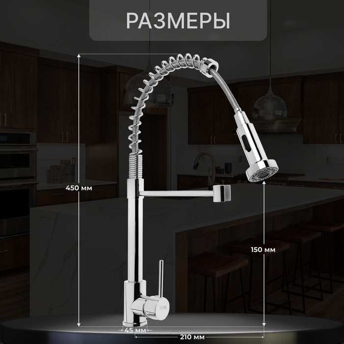 Смеситель для кухни ZEIN Z66350352, гибкий излив, картридж 40 мм, двухрежимный аэратор, хром