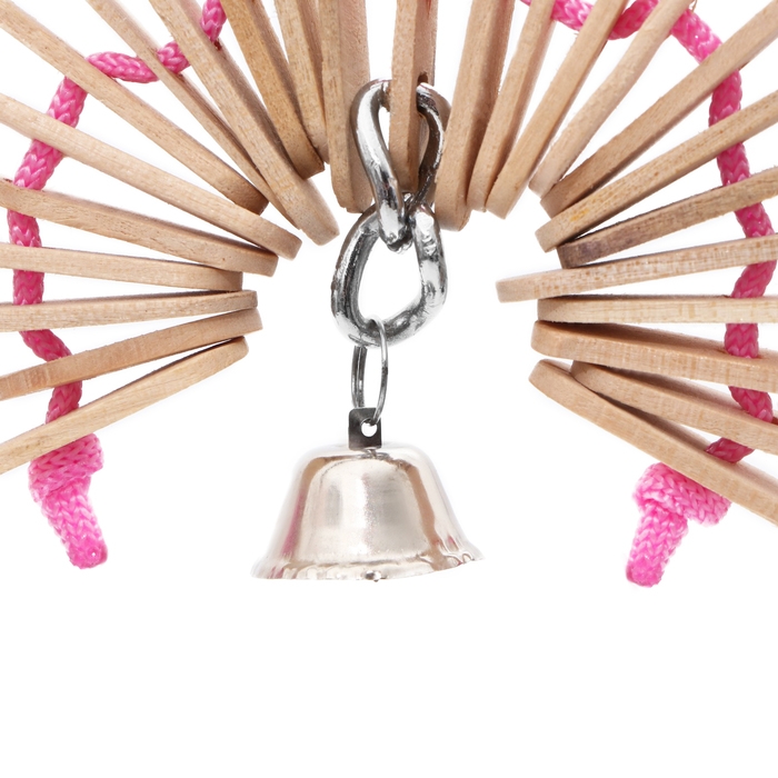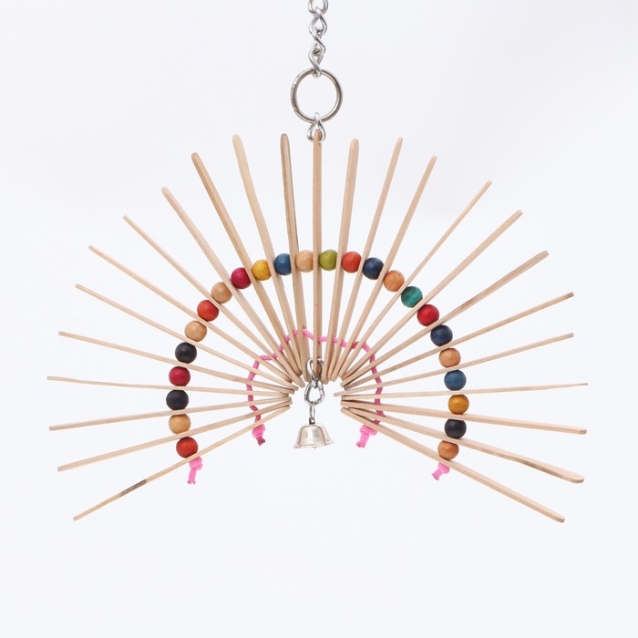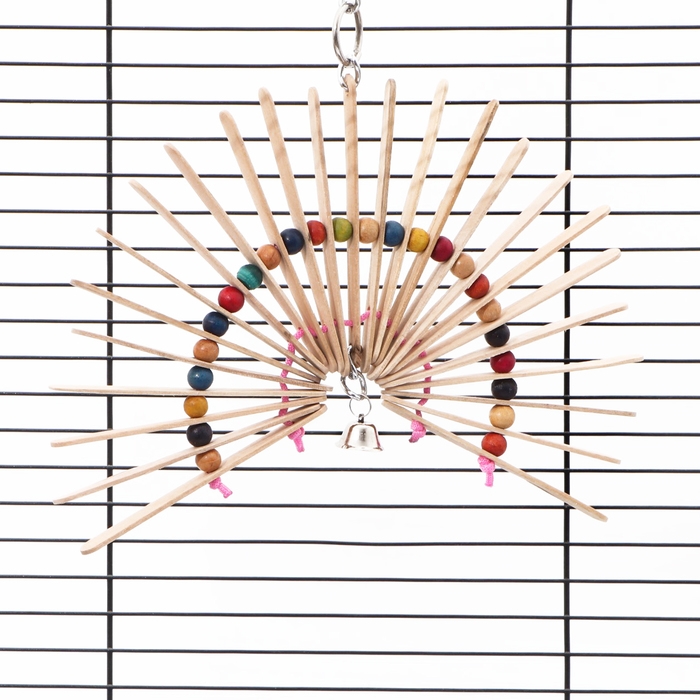 Игрушка сочетает в себе деревянные пластины, собранные в форму веера, и яркие бусины, которые не только украшают изделие, но и привлекают внимание. Когда веер вращается, издается мелодичный звон колокольчика, который станет любимым звуком для вашей птицы. Игрушка отлично подходит для попугаев и других мелких птиц, помогая им развлекаться и развивать физическую активность.