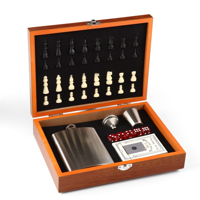 Набор 6 в 1: фляжка 8 oz, стопка, воронка, карты, кубики 5 шт, шахматы, 18 х 24 см