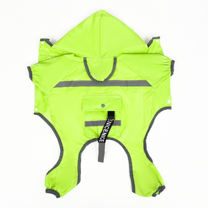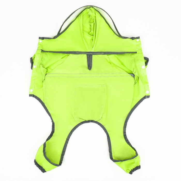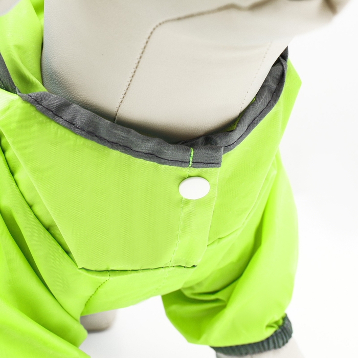 Комбинезон застегивается на кнопки, на лапах есть утягивающие резиночки, а на капюшоне есть прозрачный козырек, который защитит вашего питомца от ветра, пыли и дождя.
