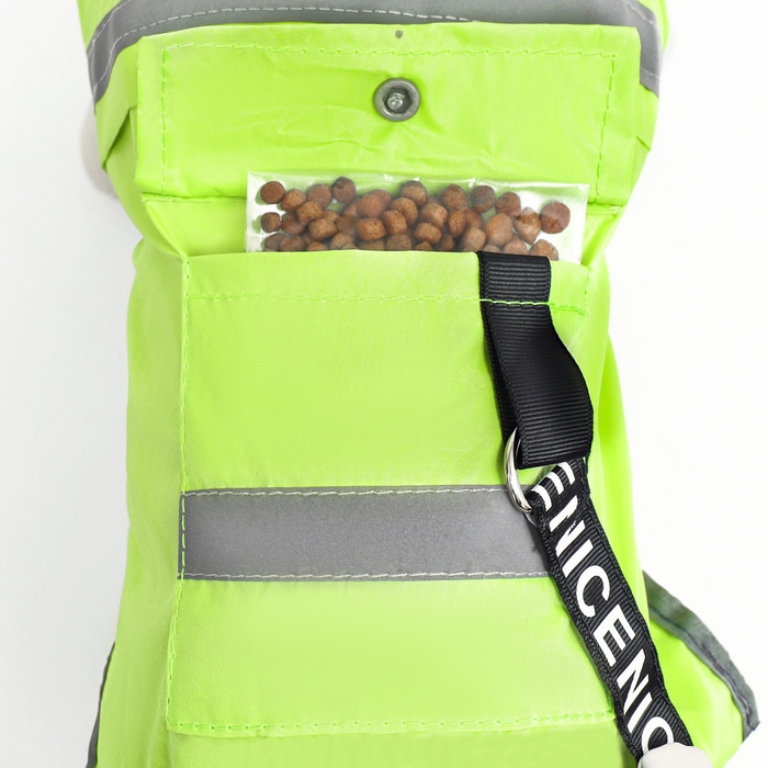 Также по всему комбинезону имеются светоотражающие полосы, отверстие для быстрого пристегивания поводка и кармашек для лакомств.