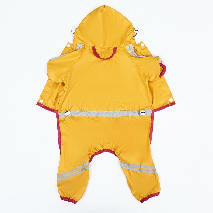 Комбинезон застегивается на кнопки, на лапах есть утягивающие резиночки, а на капюшон защитит вашего питомца от ветра, пыли и дождя.