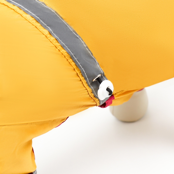 Комбинезон застегивается на кнопки, на лапах есть утягивающие резиночки, а на капюшон защитит вашего питомца от ветра, пыли и дождя.