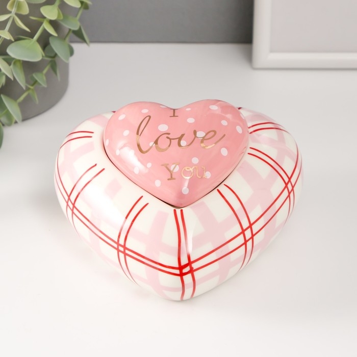 Шкатулка керамика "Розовое сердце в горошек, в клеточку" 15,7х15,3х8,2 см