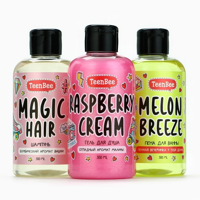 Подарочный набор косметики, шампунь для волос, гель для душа, пена для ванны, 3 х 300 мл, аромат вишни,малины и дыни, TeenBee