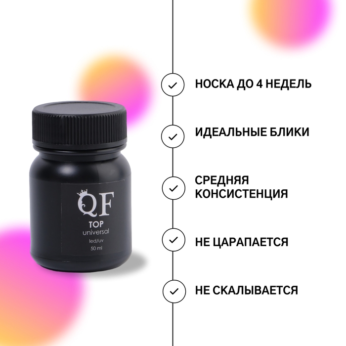 Топ для гель-лака служит закрепляющим и иногда декорирующим слоем для покрытия ногтей. Верхнее покрытие запечатывает гель-лак и обеспечивает длительную носку и стойкость маникюра. Благодаря разнообразию видов покрытий можно создавать различные эффекты от матирования до мерцания.